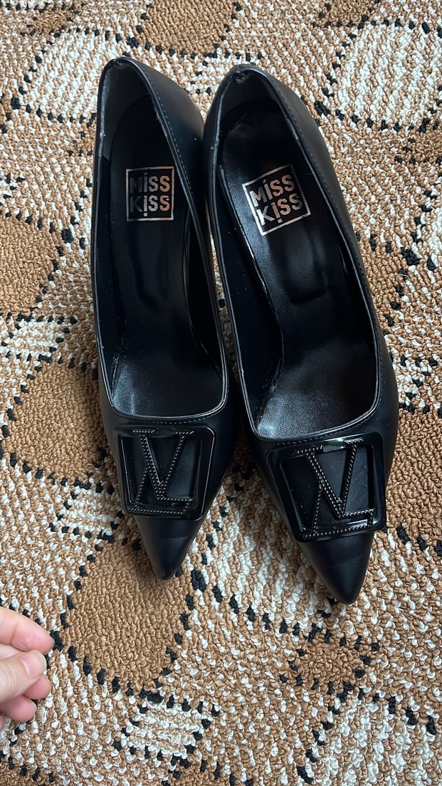 Siyah deri, topuklu ve tokalı kadın stiletto. Hafif yılan derisi desenli, modern klasik tarzda, ofis için uygun.