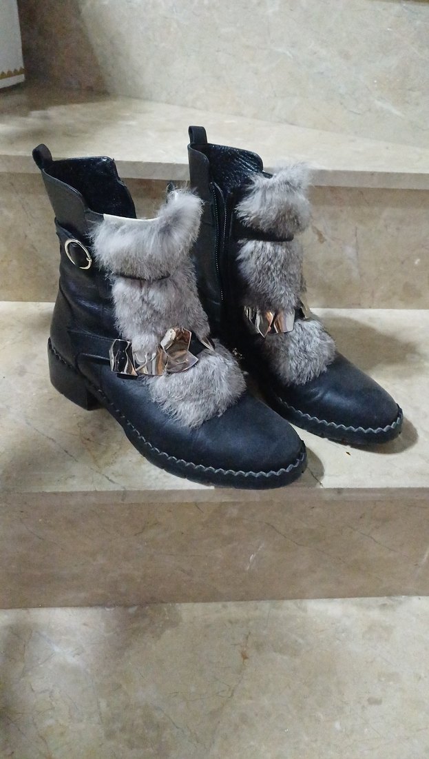 siyah Deri Tüylü Blok Topuklu Kadın Bot