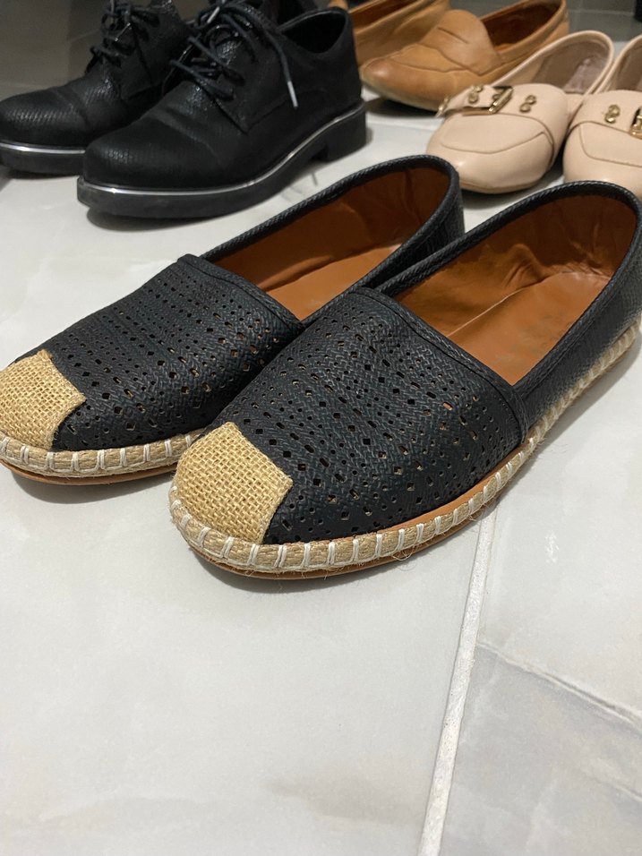 Siyah deri ucu hasır espadril, yumuşacıktır rahattır