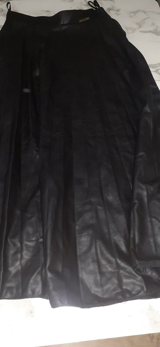 Drapeli tasarıma sahip siyah deri uzun etek, gotik parti stiline uygun. Koyu renk ve fit kesimiyle avant-garde bir görünüm sunar.