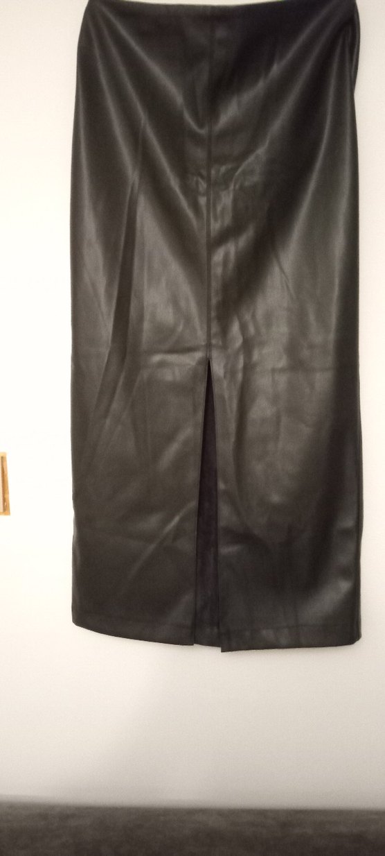Dar kesim siyah deri uzun etek, ön yırtmaç detaylıdır. Minimalist gotik tarzı ve trend avangard görünümü ofis için uygundur.
