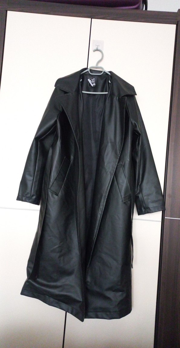 Siyah deri, uzun kesim ve kuşaklı bel detayıyla, gevşek kesim ve askılı kollara sahip goth tarzı kadın kabanı. Ofis için uygun.