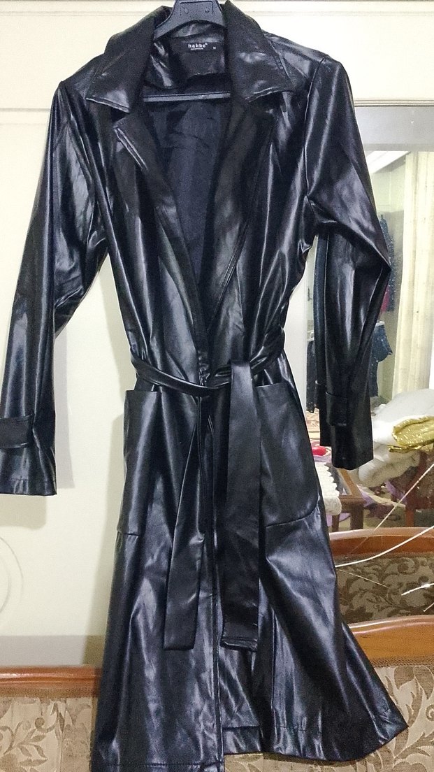 Fitted kesim siyah deri uzun trençkot, notched lapel ve strappy kollara sahiptir. Bel kemeri ile tamamlanmıştır, günlük kullanıma uygundur FOTOĞRAFTA GÖZÜKTÜĞÜ GİBİ HİÇBİR SORUNU YOKTUR M BEDEN
