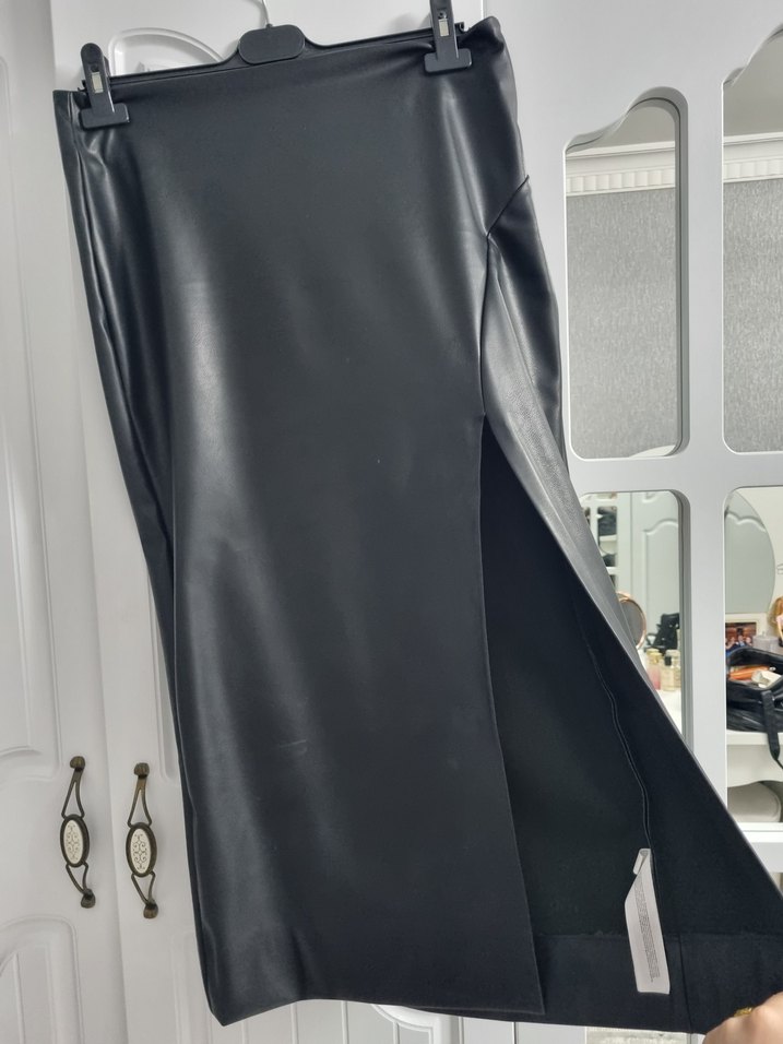 Siyah deri uzun kalem etek, yırtmaç detaylı ve desensiz, gotik tarzda ofis kullanımı için uygun.birkez giyildi hiçbir deformasyon yok