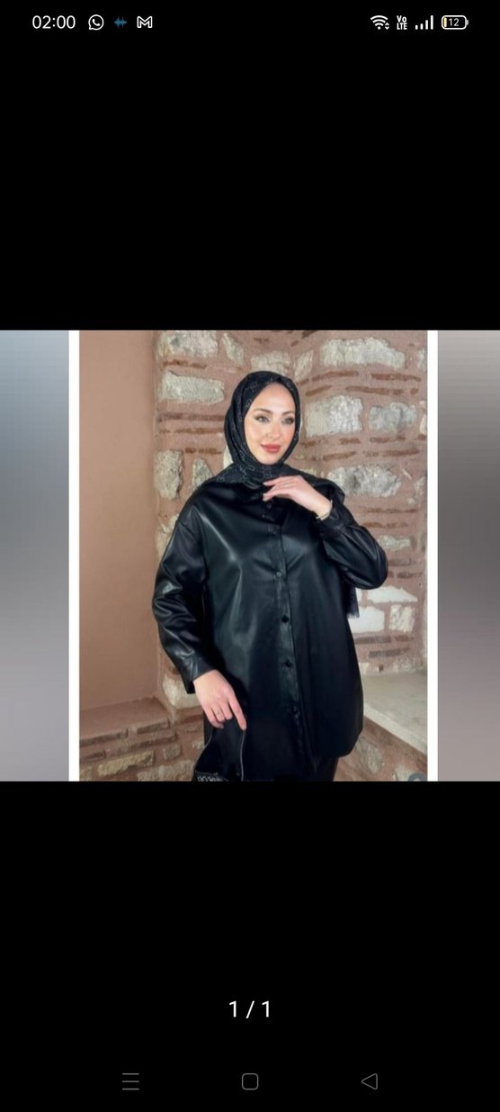 Uzun kesim, bol paça siyah deri ceket, uzun kollu ve yüksek yakalıdır. Etnik desenlerle sokak stilini yansıtan rahat ve şık bir tasarım.