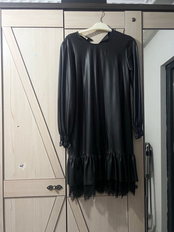 Siyah deri, uzun kollu, bol kesim elbise. Etek kısmında fırfır detayları bulunur. Yuvarlak yaka ve desensiz, günlük kullanıma uygun