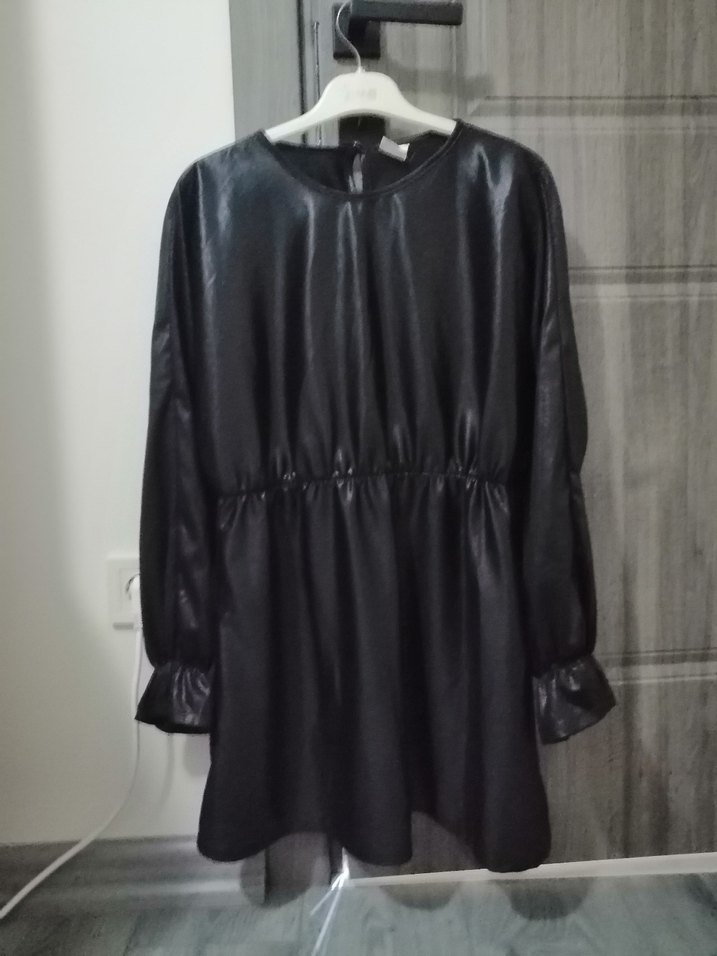 Siyah deri, uzun kollu, bisiklet yaka ve kemerli bel detayı ile bol kesim midi tunik. Günlük kullanıma uygun gotik tarzda.