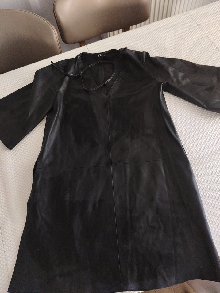 Siyah deri, uzun kollu, V yakalı ve drapeli detaylı, dar kesim , günlük kullanım için uygundur.