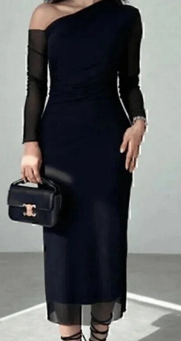 Vücuda oturan siyah deri uzun elbise . Sağ omuz açık . Sadece bir kez düğün için kullanıldı bedeni S/M