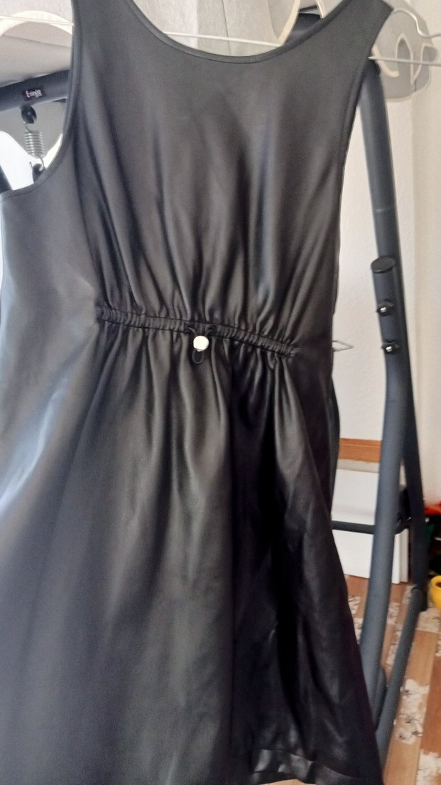 Bu siyah deri hamile tulum, fit kesim, askılı kol ve V yaka detaylarına sahiptir. Düğmeli ve parlak yüzeyli midi boyda, günlük kullanıma uygun gotik tarzda.