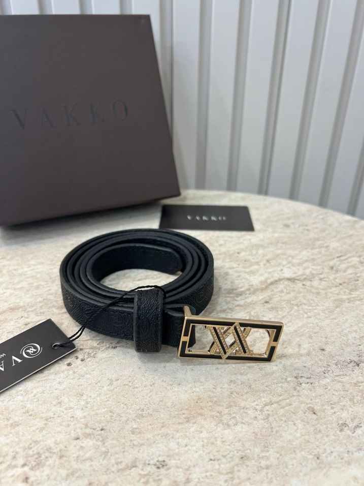 Vakko'dan siyah deri kemer, şık altın tonlu toka ile sokak modası ve iş stiline uygun.