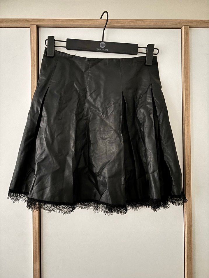 Siyah deri midi etek, volanlı ve dantel detaylı etek ucu ile rahat kesim sunar. Gotik tarz ve romantik akşamlar için uygundur.