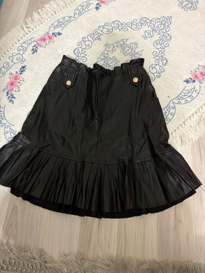 Siyah Deri Volanlı Mini Etek