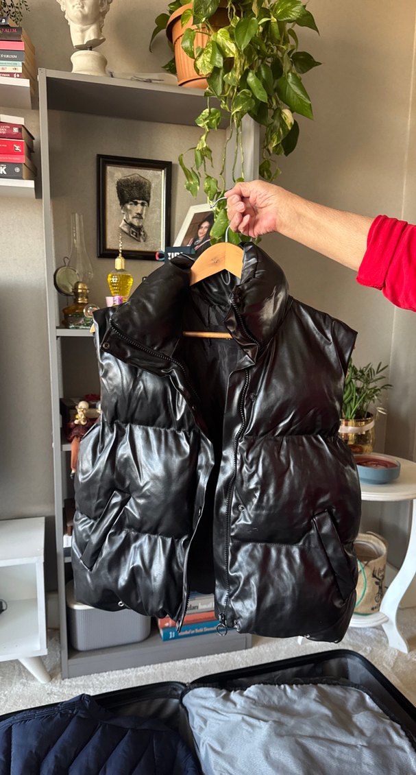 Siyah deri yelek, yüksek yakalı ve fermuarlı. Midi boyda, fitted kesim, günlük kullanım için rahat ve şık bir sokak stili parçası.