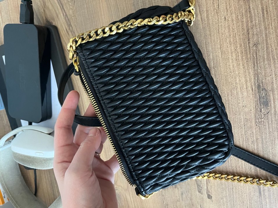 Siyah deri yılan desenli fermuarlı çanta, altın zincir askıya sahip. Sokak stili ve günlük kullanım için uygundur.