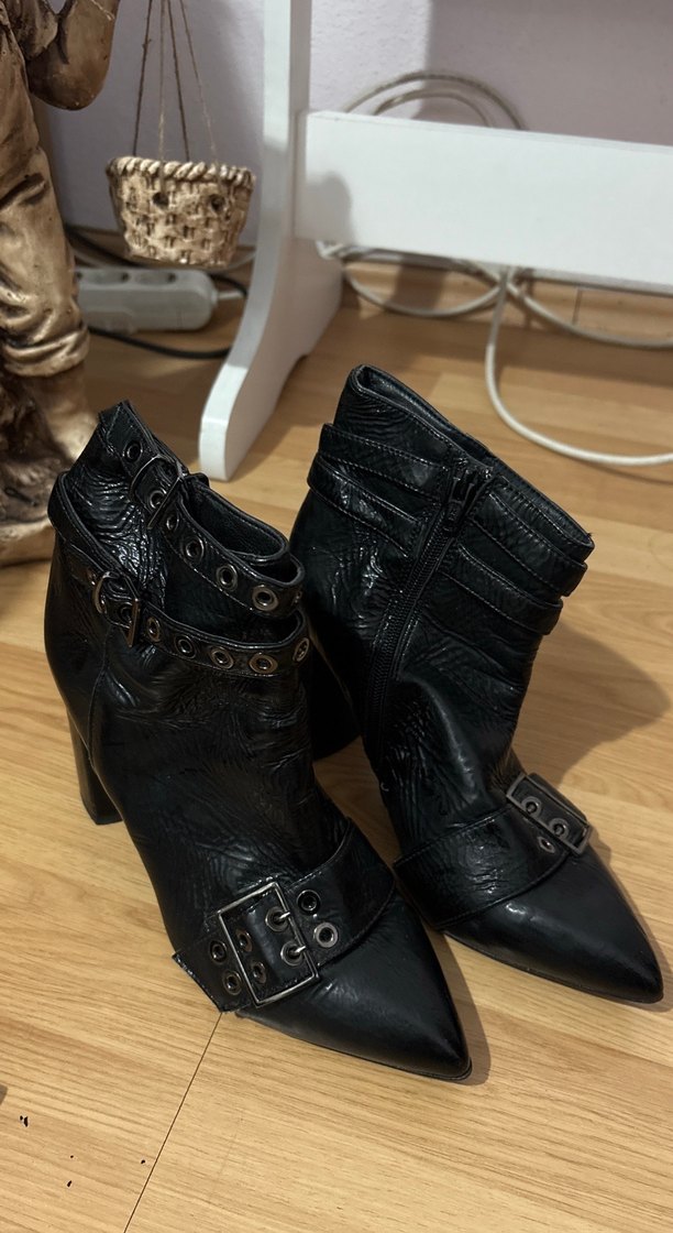 Yılan desenli siyah deri, tokalı ve blok topuklu gotik tarzda botlar. Rock punk havası verir, günlük kullanıma uygundur.
