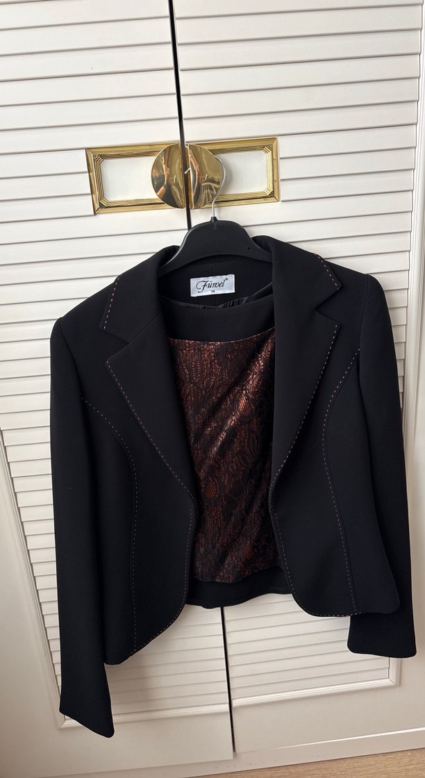 Siyah deri yılan desenli kadın blazer, kesik yaka, uzun kollu ve fermuarlı. Kısa ve regular fit, ofis için şık bir tercih.