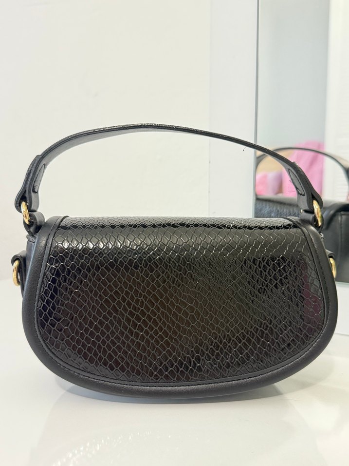 Siyah deri yılan desenli kadın çantası, kemerli detaya sahiptir. Modern klasik stil ile Paris şıklığını günlük kullanıma sunar.