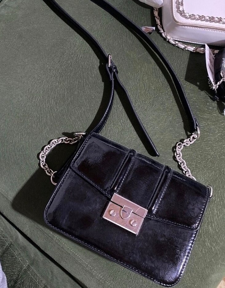 Siyah deri, yılan desenli kadın çanta. Gümüş tokalı, zincir ve deri askılıdır.