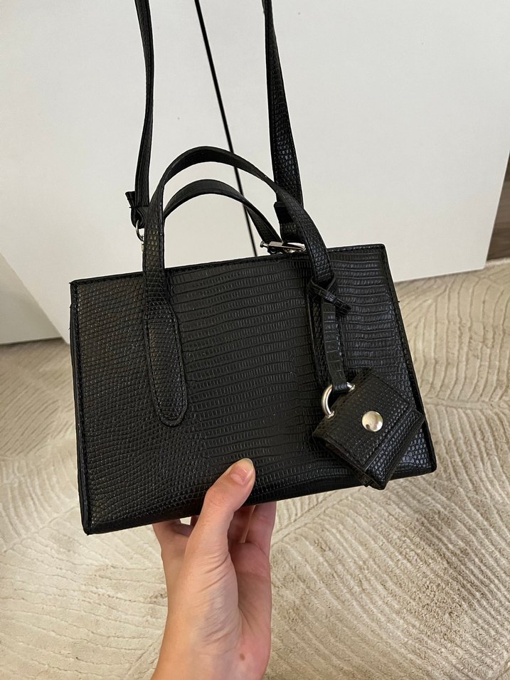 Siyah deri, yılan desenli ve kemerli detaylı kadın çantasıdır. Düz ve gotik tarzı günlük kullanım için uygundur. Sadece bir kez kullandım aşırı şık ve gösterişli. iki şekilde de kullanılabilir sapı çıkarılıyor.