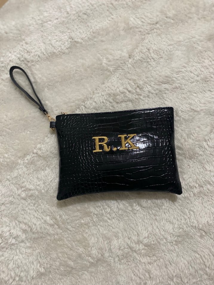 Parlak yılan desenli siyah deri clutch çanta, kürk detaylı ve önünde "R.K" harfleri bulunur. Bilek askısıyla günlük kullanım için uygundur. markası belirsz