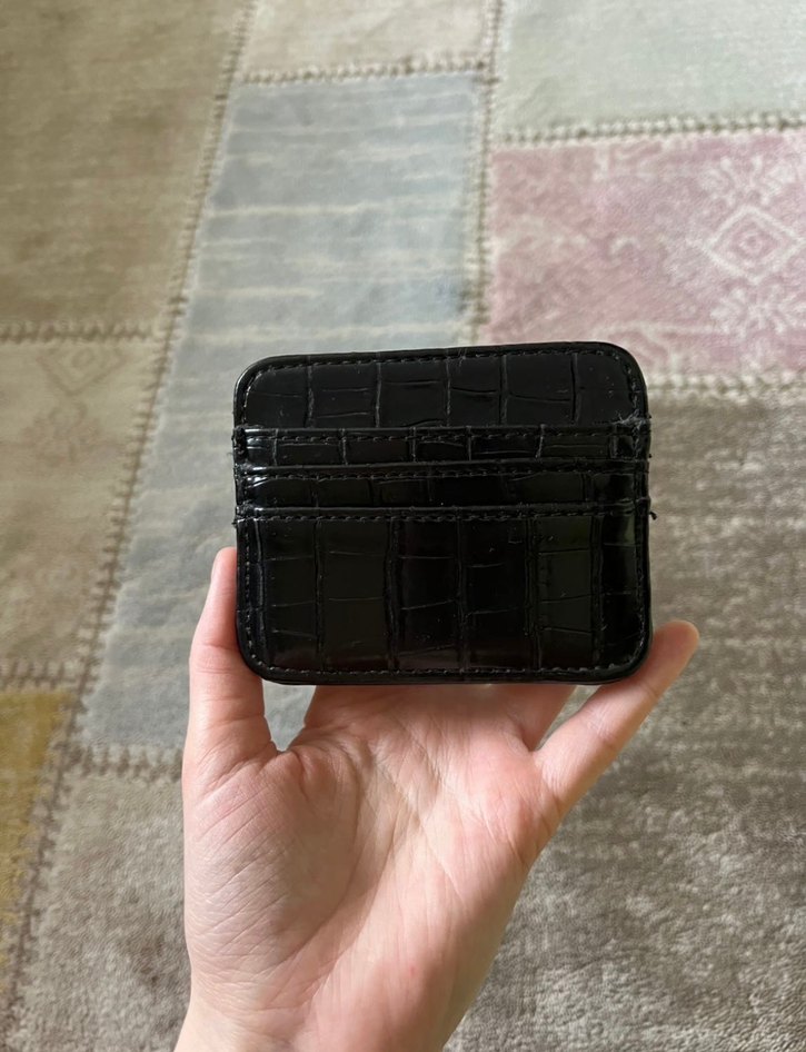 Siyah deri, yılan deseni ve tokalı detaylı kadın cüzdanı, günlük kullanıma uygun sade sokak stiliyle uyumlu.
