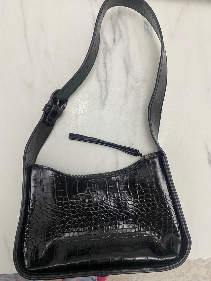 Siyah Deri Yılan Desenli Kemerli Çanta