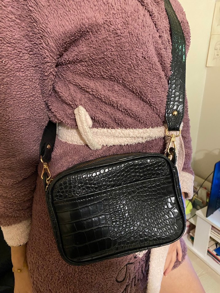 siyah deri yılan deseniyle kaplı, tokalı askısı olan günlük kullanıma uygun rahat omuz çantası.