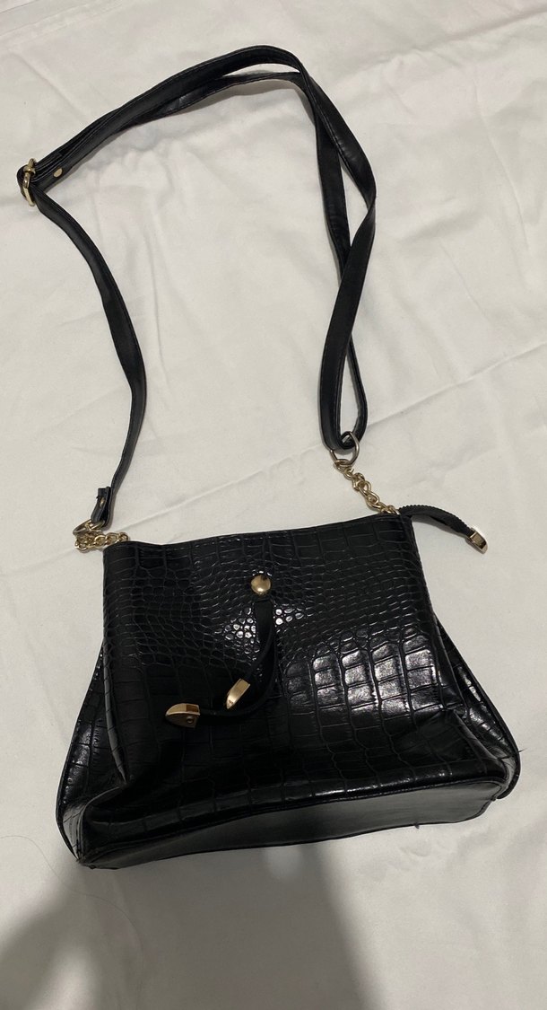 Siyah deri, yılan desenli, çanta üç bölmeli hiç bir yerinde bir şeyi yoktur