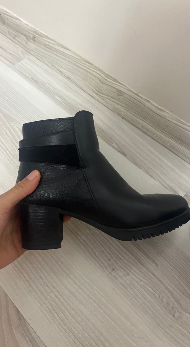 deride soyluma vs yoktur. pazarlık olur. Siyah deri yılan deseni ve tokalı şerit detaylı, blok topuklu kadın botu. Trendy gotik tarz için ideal.