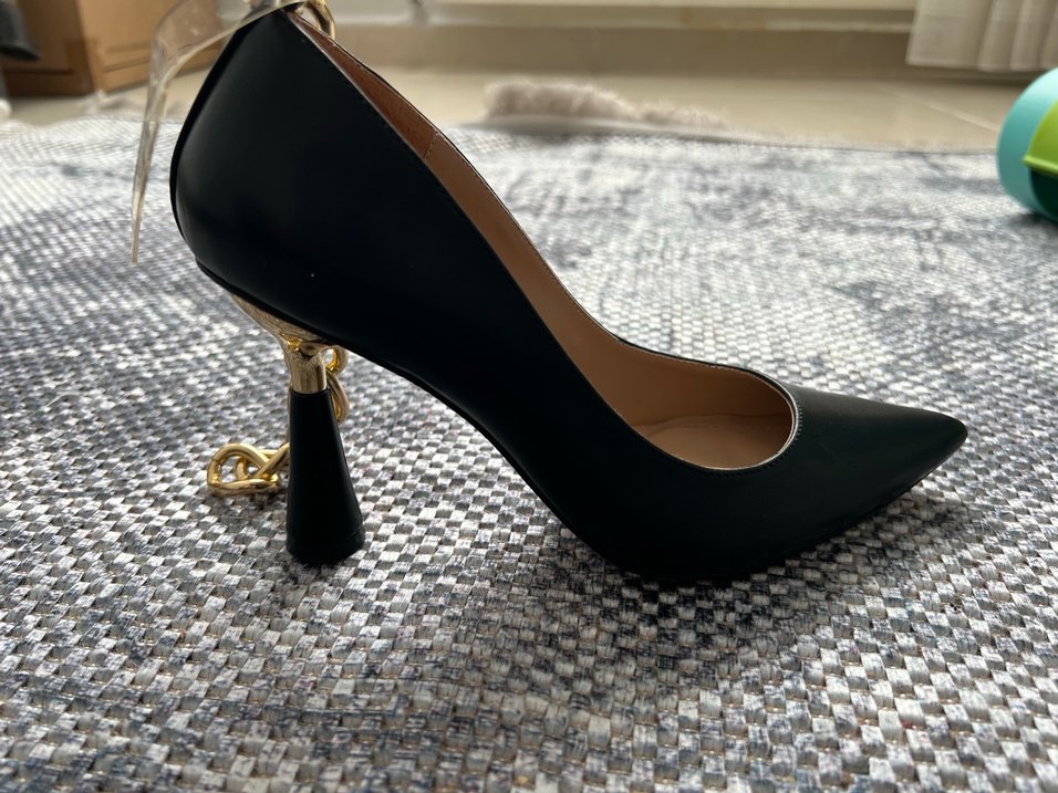 Siyah deri, parlak yılan desenli ve zincir detaylı stiletto. Modern klasik tasarım, ofis kullanımı için uygun.