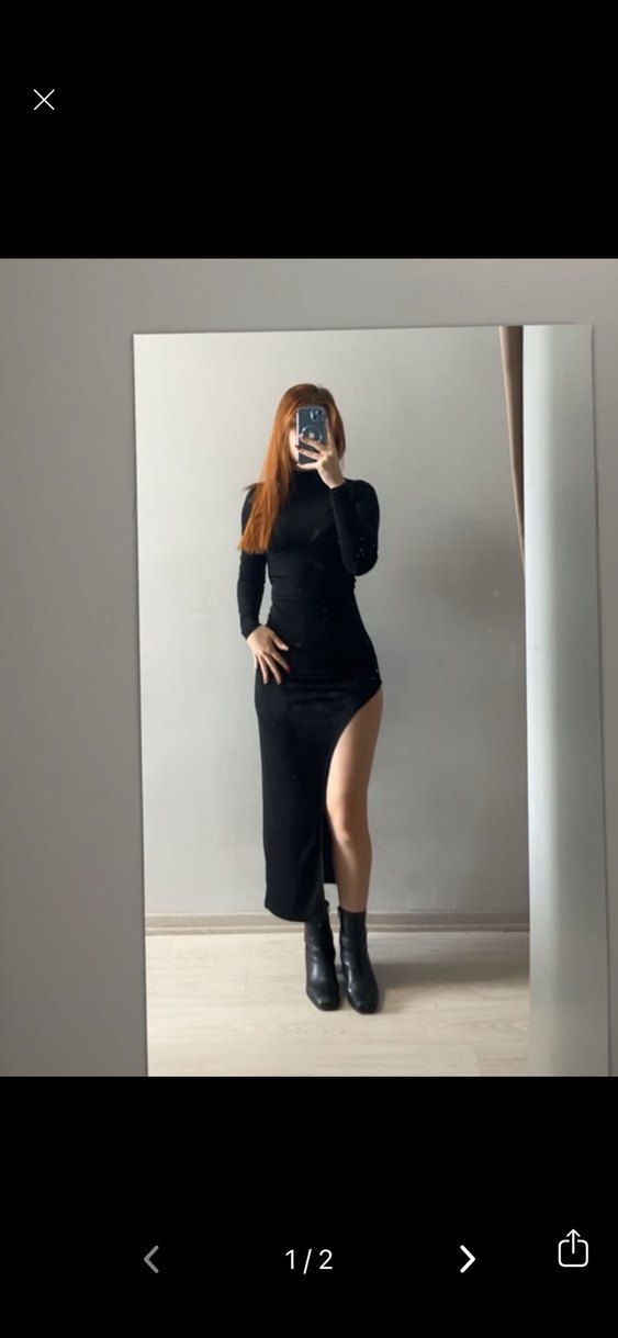 Siyah deri, uzun kollu, yüksek yakalı ve yırtmaçlı dar kesim midi elbise. Cesur gotik tarzıyla dikkat çeker.