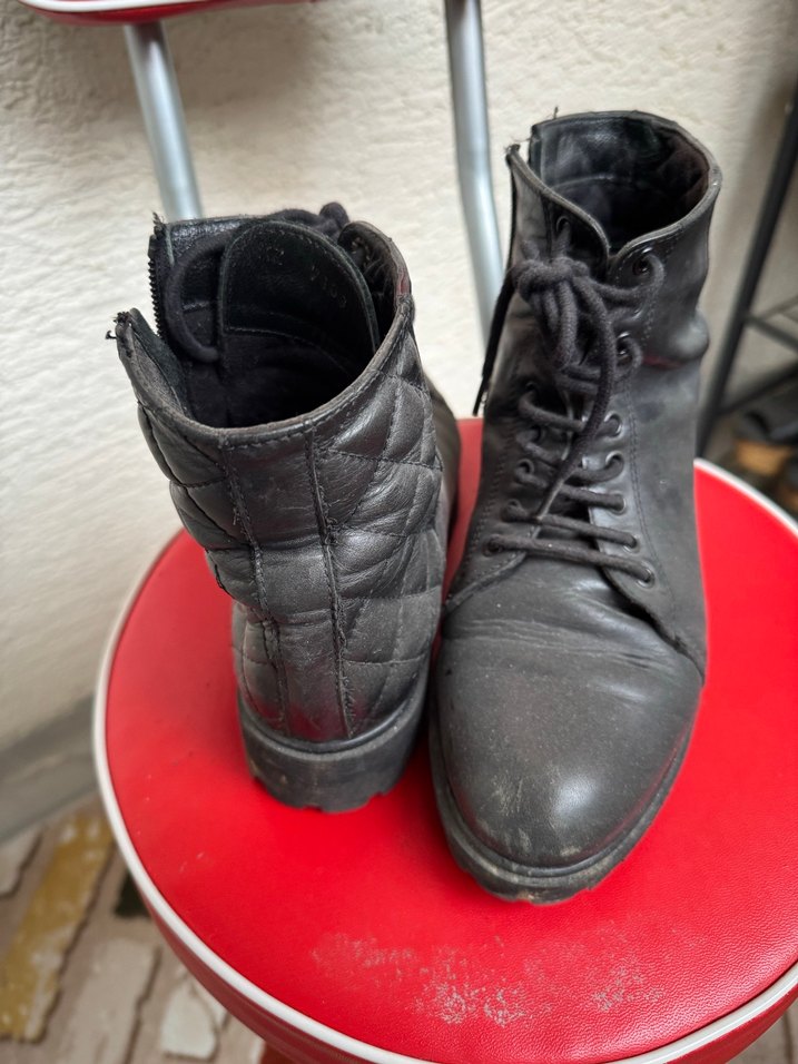 Siyah deri, yüksek topuklu ve bağcıklı, tokalı detaylara sahip günlük kullanıma uygun goth punk tarzında botlar.