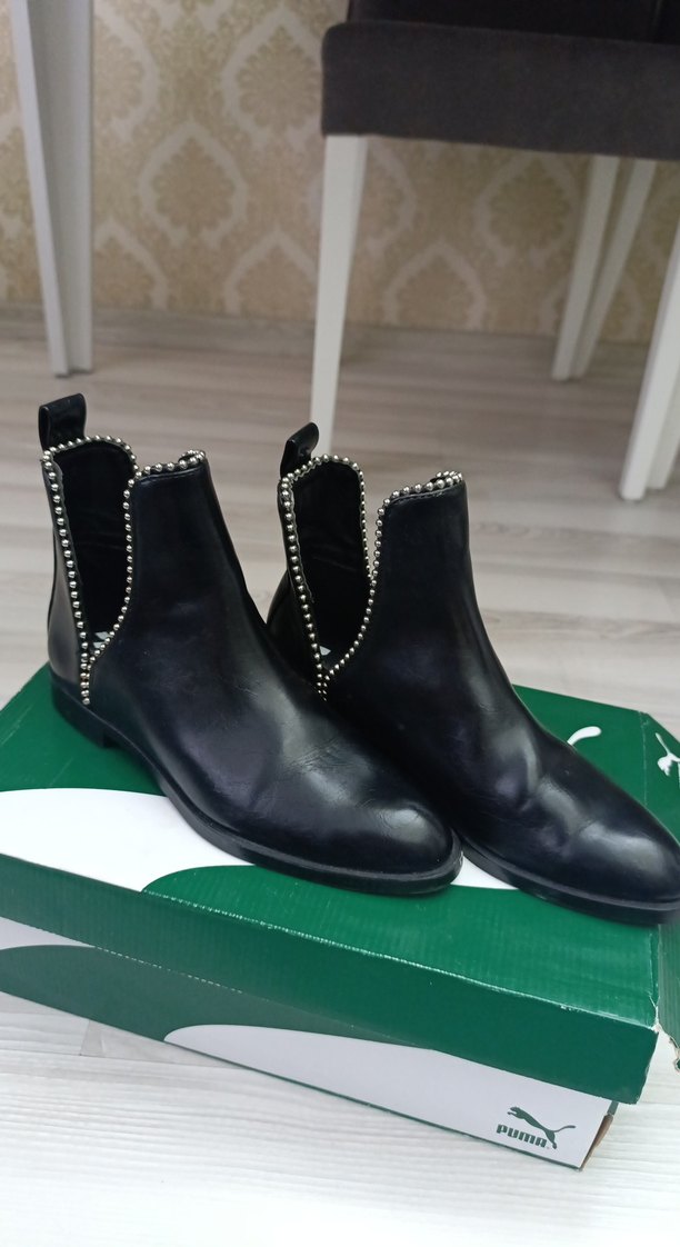Siyah deri, yüksek topuklu gotik botlar, gümüş çiviler ve tokalı detaylarla avant-garde tarzı sevenlere uygun. hiç kullanılmadı
