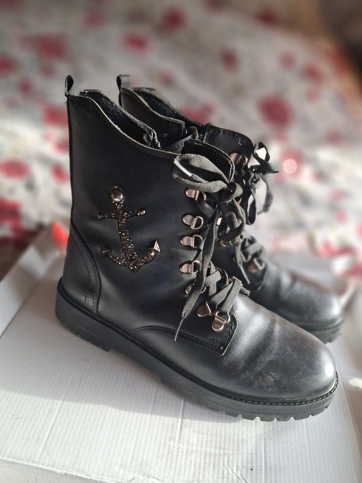 Siyah deri yüksek topuklu botlar, tokalı detaylar ve nakışlı çapa deseniyle günlük kullanıma uygun grunge punk tarzında. ⚓