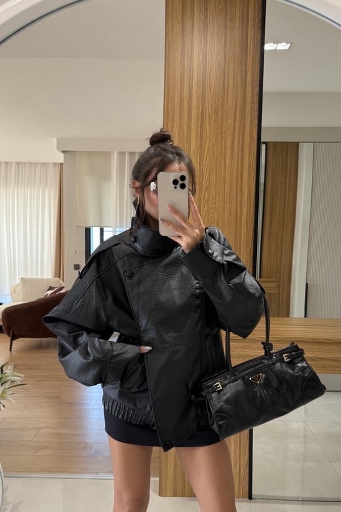 Yüksek yakalı, uzun kollu siyah deri ceket. Gevşek kesimi ve midi boyu günlük sokak stiline uyum sağlar. Desensiz tasarımı ile zahmetsiz şıklık sunar.