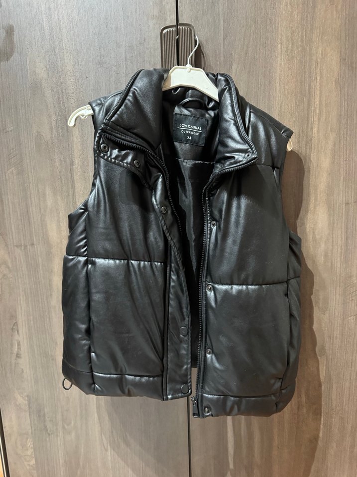 Siyah deri, yüksek yakalı ve fermuarlı önü ile trend sokak stiline uygun, dar kesim kadın yelek. Kolsuz ve normal midi boyda, günlük kullanıma uygundur.