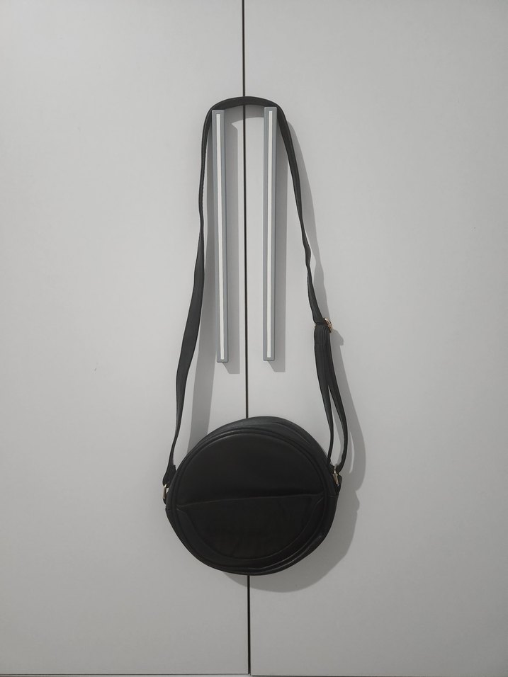 Siyah deri yuvarlak kadın çanta, kemerli tasarımı ve minimalist goth stiliyle spor veya şık kombinlere uygundur.