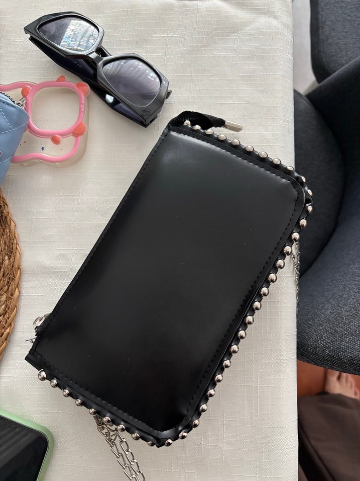 Siyah deri, fermuarlı ve metal boncuk detaylı goth tarzı minimalist kadın el çantasıdır. / Yeni aldım 2 kez kullandım