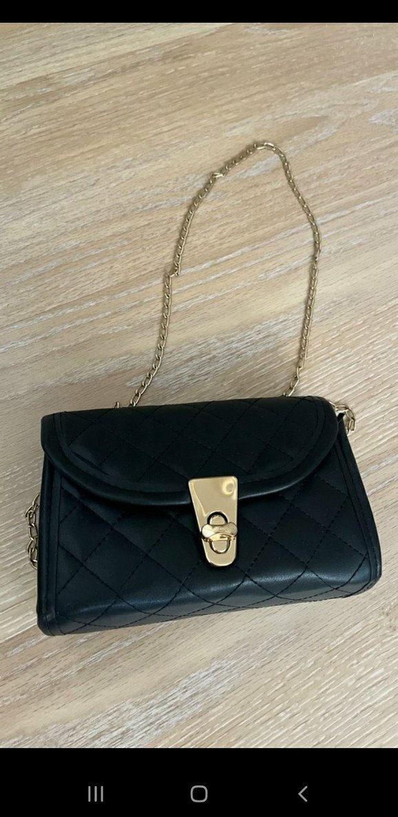 Siyah deri, tokalı ve zincir askılı kadın çantası, klasik Paris tarzı ve desensiz tasarıma sahip.