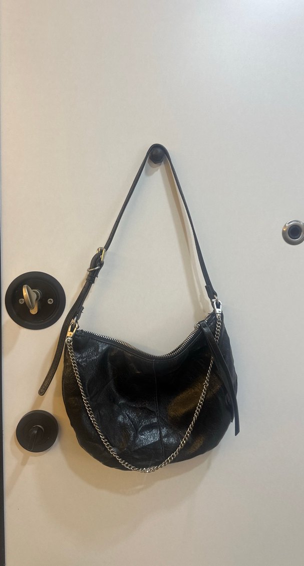 Siyah deri, yılan deseni ve zincir detaylarıyla biker tarzını yansıtan, Paris esintili trend çanta.