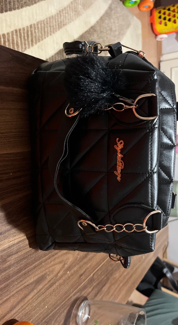 Zincir detaylı, siyah deri kadın çanta, yılan desenli ve şık ponpon aksesuarıyla. Günlük kullanım için uygun, trend gotik tarzda.