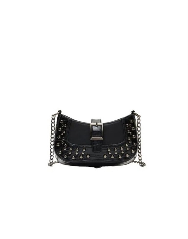 Yılan desenli siyah deri, metal zımbalı, kemerli kapanışlı ve zincir askılı punk tarzı çanta.