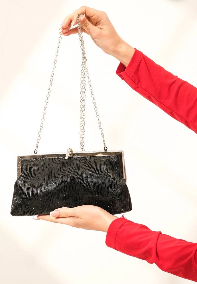 Siyah desenli abiye taş detay aksesuarlı portföy clutch çanta