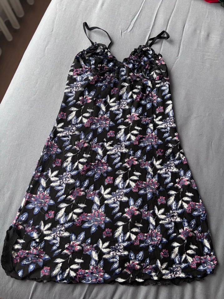 Siyah mor çiçek desenli, askılı transparan gecelik. Rahat ve şık gece kullanımı için uygundur.