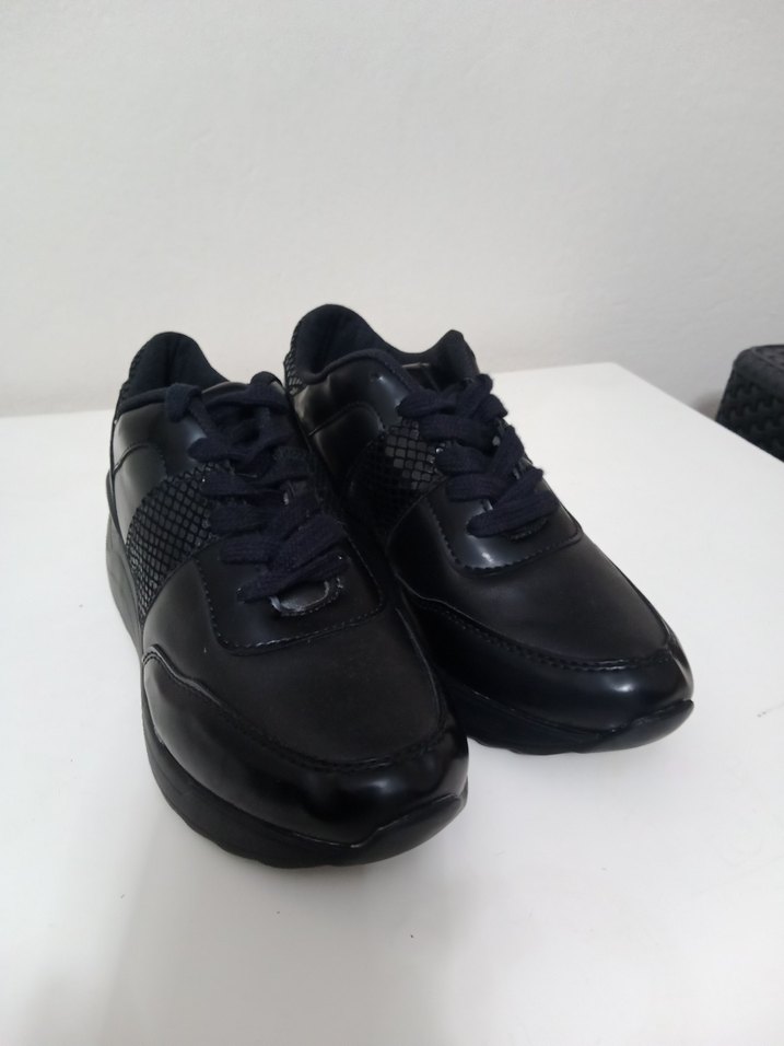 Günlük kullanıma uygun, siyah desenli, bağcıklı ve blok topuklu kadın spor ayakkabısı. Dayanıklı kauçuk malzemeden üretilmiştir.