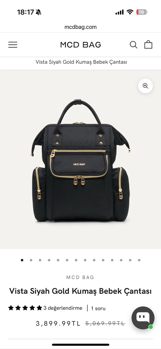 Parlak siyah renkte, çoklu fermuarlı cepleri ve baskılı MCDBAG logosu bulunan kullanışlı bebek çantası.