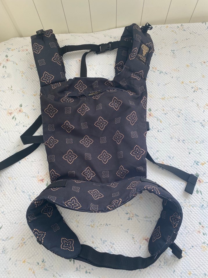 Desenli kumaşa sahip siyah bebek taşıyıcı, ayarlanabilir kayışlarla rahat kullanım sağlar. 2-3 defa kullanılmıştır. Bütün takılma aksesuarları sağlamdır
