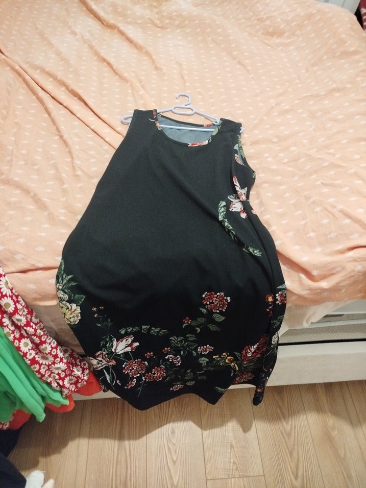 Siyah renkte, desenli, askısız ve salaş kesimli hamile elbisesi. Midi boyda, drapeli ve bohem tarzda, günlük kullanıma uygundur. Kollu değildir.