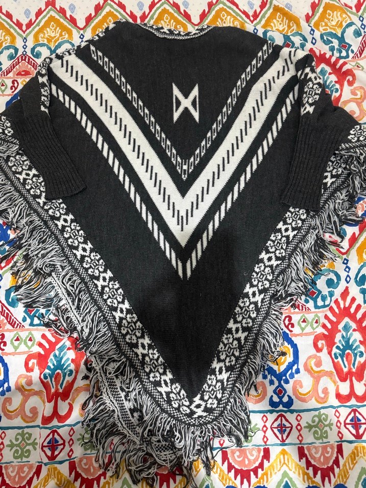 Siyah renkli, örgü dokulu ve desenli V yakalı uzun kollu kadın panço. Salaş kesim ve midi boyda, günlük kullanıma uygun bohem tarzda.